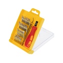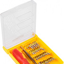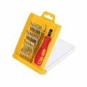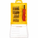 Набор отвёрток для точечных работ предназначен для выполнения прецизионных работ в электронике и электромеханике. Биты набора выполнены из хромованадиевой стали. Эргономичная двухкомпонентная рукоятка отвёртки делает работу с инструментом лёгкой и удобной. Магнитный держатель обеспечивает быструю замену и надёжную фиксацию насадок. Набор поставляется в пластиковом боксе и содержит 32 предмета.